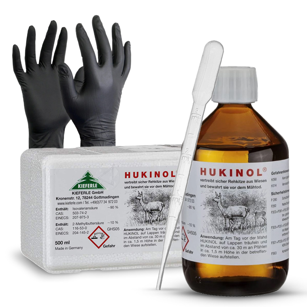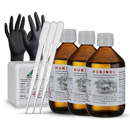 Skuteczny w odstraszaniu zwierząt leśnych, wykorzystujący specyficzne zapachy, które są nieprzyjemne dla zwierzyny. Bezpieczny dla roślin oraz gleby. Hukinol, ze względu na swoje właściwości, utrzymuje swoją skuteczność przez około 2 tygodnie w normalnych warunkach pogodowych.